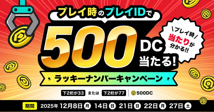 さらに、プレイIDの末尾数字でDCが当たるラッキーナンバーキャンペーン、対象の新プライズが特別価格でプレイできるイベント、対象景品が50%オフになるセールも行われます。
