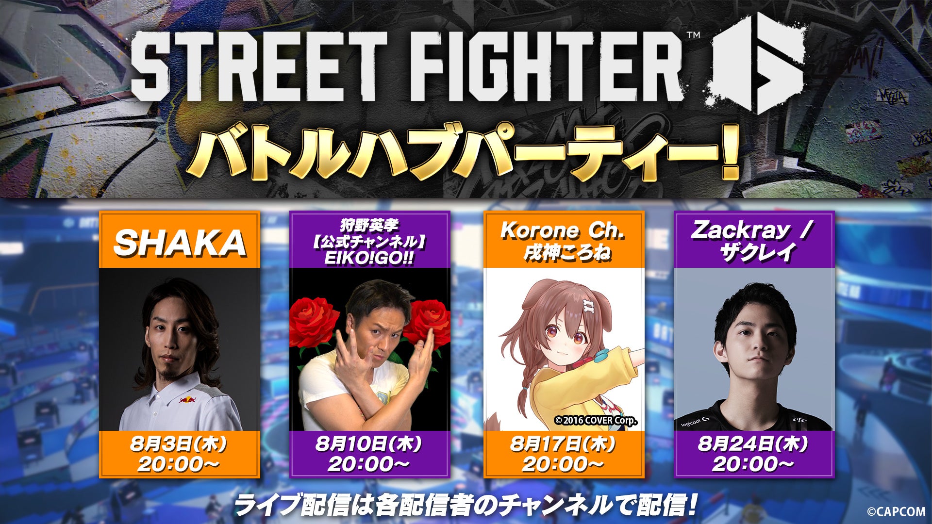 8月3日(木)から、人気のゲーム配信者であるSHAKAさん、狩野英孝さん、戌神ころねさん、ザクレイさんによる「バトルハブパーティー!」が開催されます。