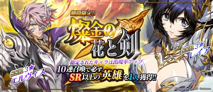 - 期間限定召喚『燦金の花と剣』でSSRエルヴィスとレイアの出現確率アップ。