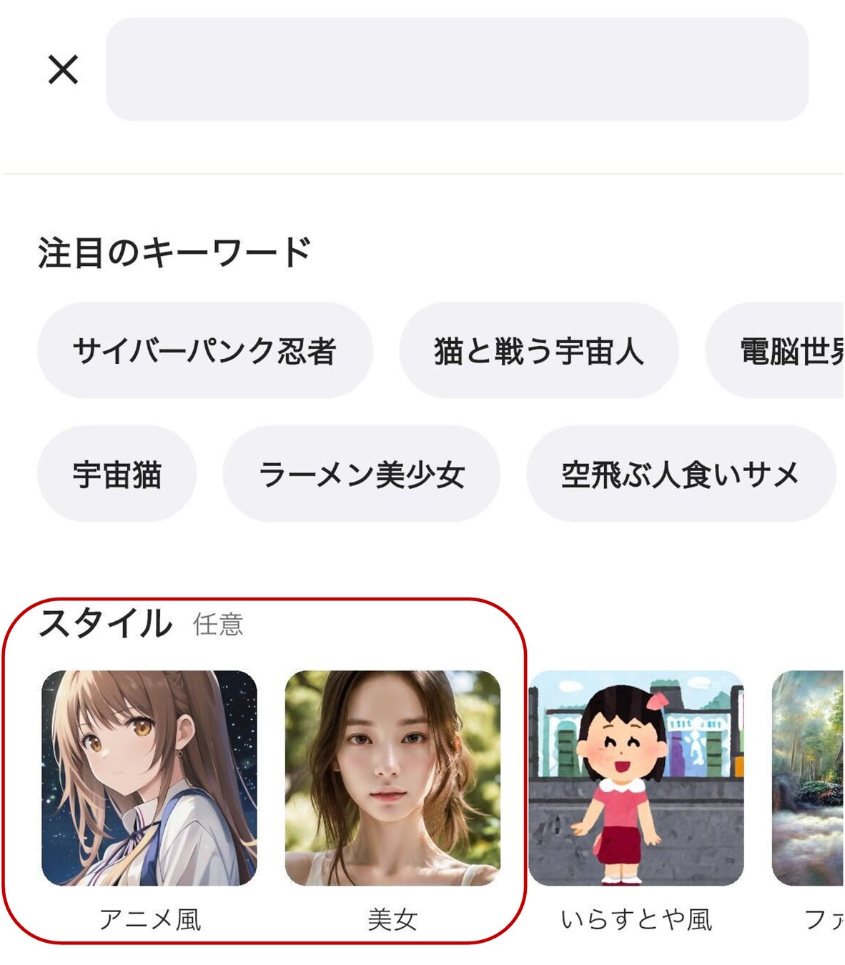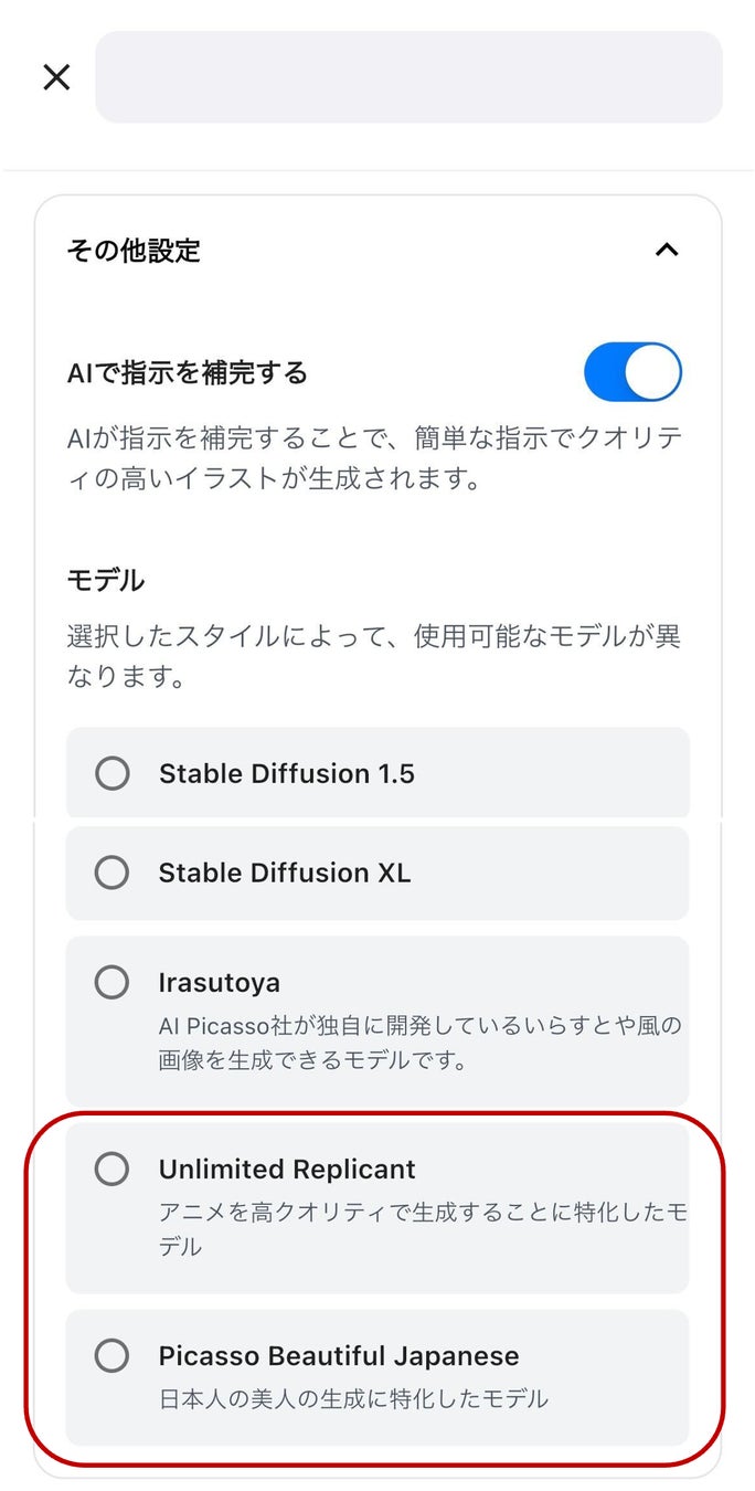 最新の機能として、「AIピカソ」のアプリ内で日本人の美女とアニメに特化した画像生成が可能になりました。