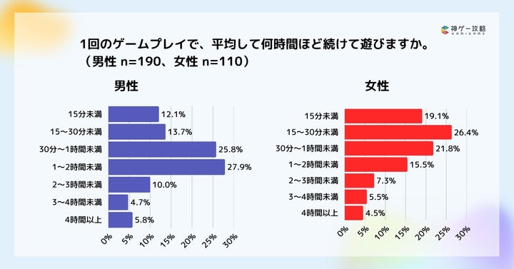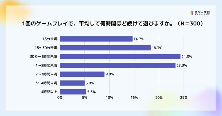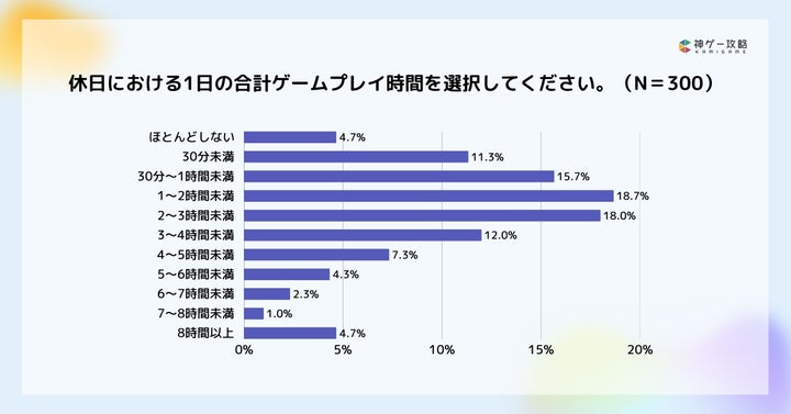 - 休日は「1〜2時間未満」が最多で、平日よりプレイ時間が長くなる傾向。