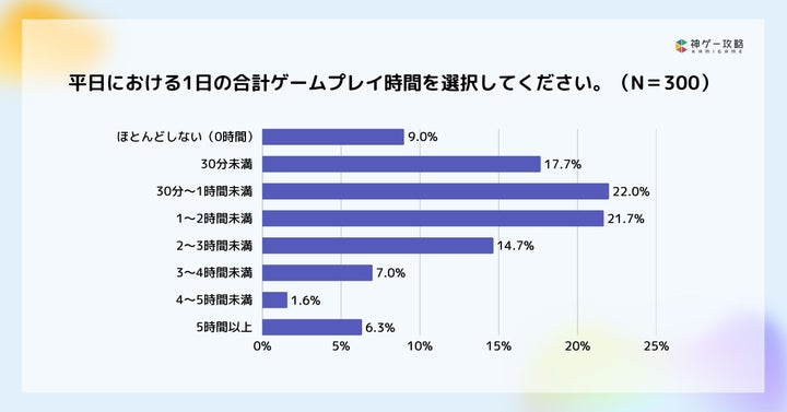 - 平日のプレイ時間は「30分〜1時間未満」が最多。