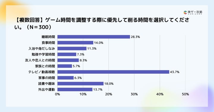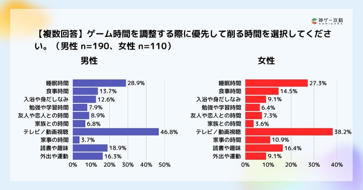 ゲームプレイのために削る時間としては、男女ともにテレビ/動画視聴が最も多いという結果が出ています。