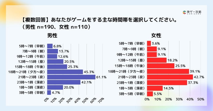 男女別では、女性の方がプレイ時間が短く、プレイ時間帯は21~23時が最多です。