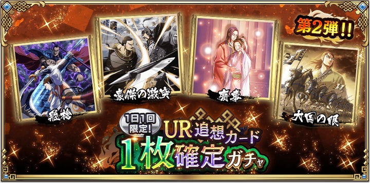 『年末大戦-乱-2025』では、年末積み荷パック販売、1日1回限定UR武将/追想カード確定ガチャ、年末★6ランクアップガチャ、SRピックアップガチャ、EX追想ガチャ、UR秦国武将セレクトガチャ、季節追想ピックアップガチャ、王と弟イベントなどが開催されます。