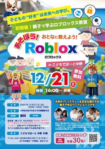 2025年12月21日に開催されるこの教室では、「ネット詐欺からの子どもの保護」「保護者の設定・管理方法」「子どもの”好き”を学びにつなげる視点」をテーマに、Robloxをプレイしながら学びを深める。