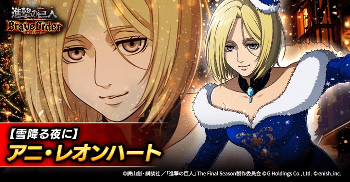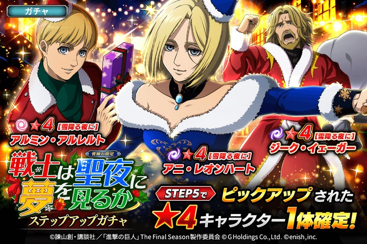 同日より、【雪降る夜に】アニ・レオンハート、【雪降る夜に】アルミン・アルレルト、【雪降る夜に】ジーク・イェーガーが登場する「戦士は聖夜に夢を見るかガチャ」も開催。