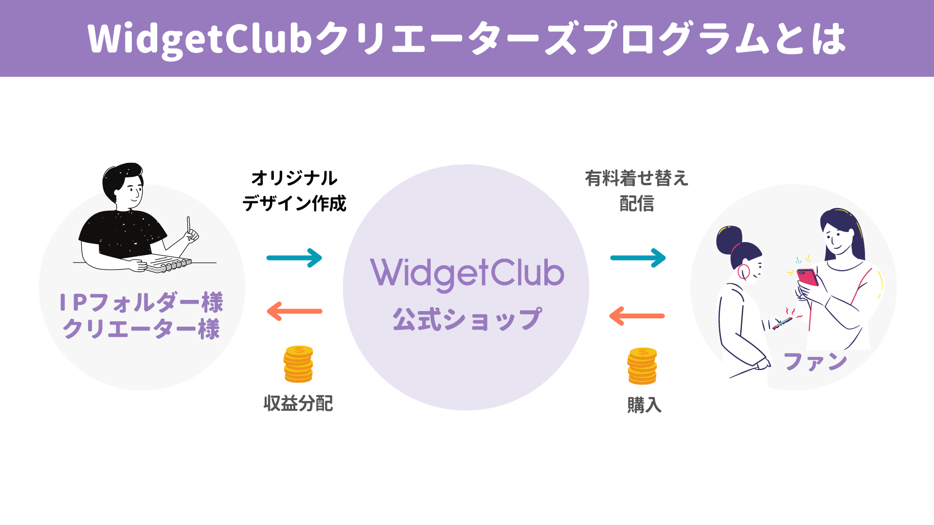 IPビジネス・ファンビジネスを展開する法人さまが持つ素晴らしいコンテンツをWIdgetClubに配信・販売することができます。マネタイズの新規チャネルとしてご利用ください。