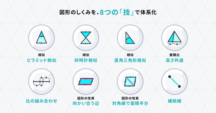 - 相似・面積比の問題を、8つの技で体系的に学習できる。