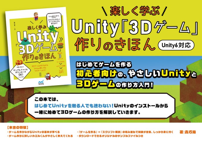 株式会社マイナビ出版から、Unityを使った3Dゲーム制作の入門書『楽しく学ぶUnity「3Dゲーム」作りのきほん』が12月16日に発売される。