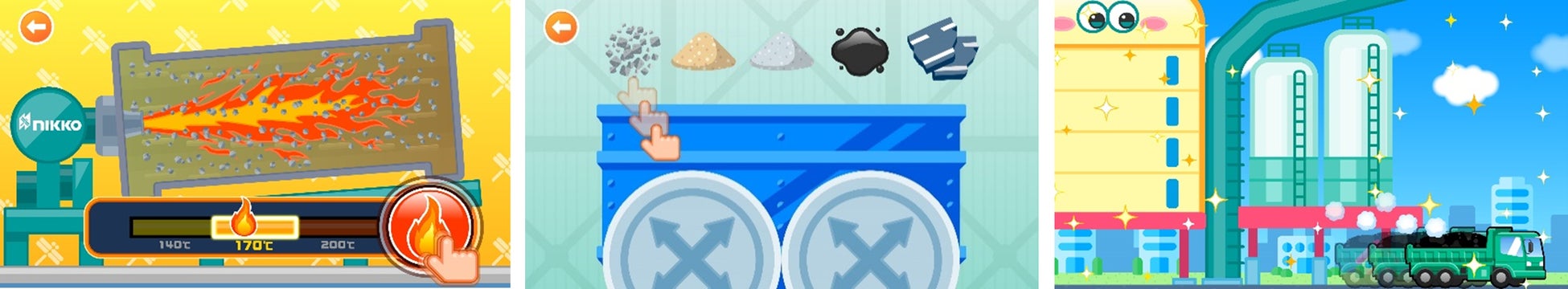このゲームでは、アスファルト合材の製造工程を体験する「アスファルトごうざいづくり」と、壊れた道路を補修する「どうろをなおそう」の2つのゲームが楽しめます。