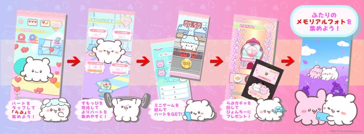 ゲーム内では、ハートを集めて「らぶ」を溜め、キャラクターを育てながら“ふたりのメモリアルフォト”をコレクションしていきます。