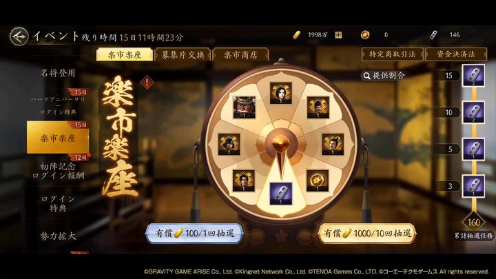 目玉は、SSR武将「上杉謙信・伝」が獲得できる期間限定イベント「楽市楽座」と、ログインボーナス、SNSキャンペーン。