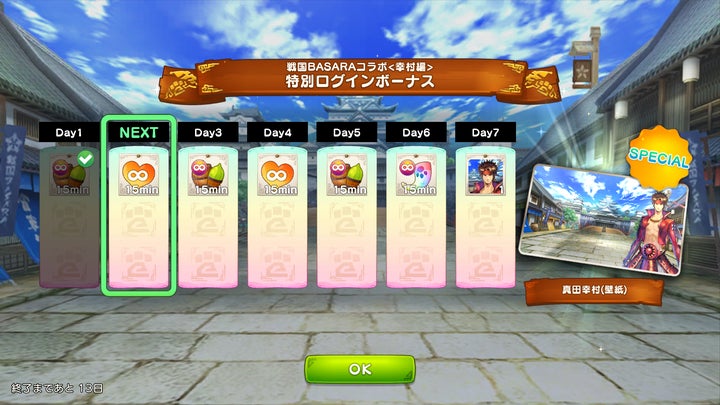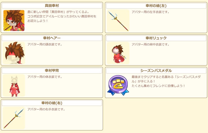 - 真田幸村をテーマにしたコラボイベントで、キャラクターや衣装、壁紙などを入手可能。