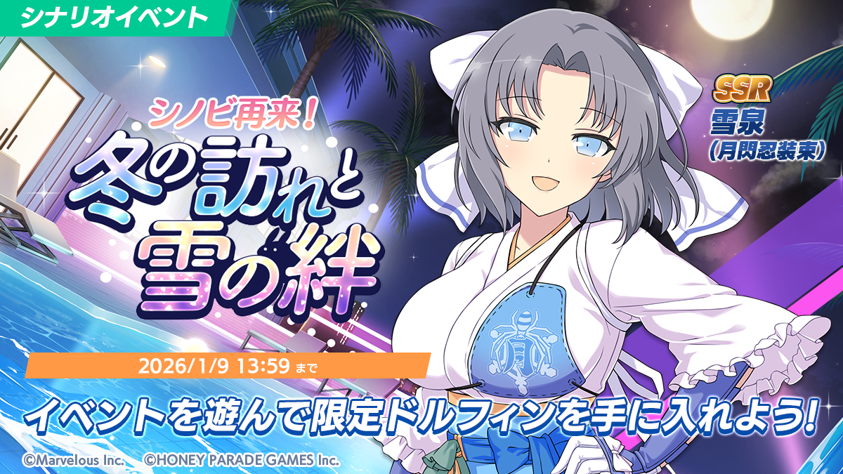 2025年12月19日(金)から2026年1月9日(金)まで、コラボガチャ「閃乱カグラコラボドルフィンフェスUNISONガチャ」が開催され、「UR 雪不帰(黒水着バニー)」と「UR雪泉(白水着バニー)」が登場します。