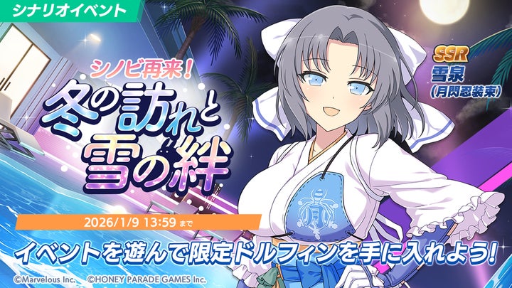 シナリオイベント「シノビ再来!冬の訪れと雪の絆」も開催され、イベント限定アイテムを集めることで、コラボ限定SSRドルフィン強化素材や育成素材が手に入ります。