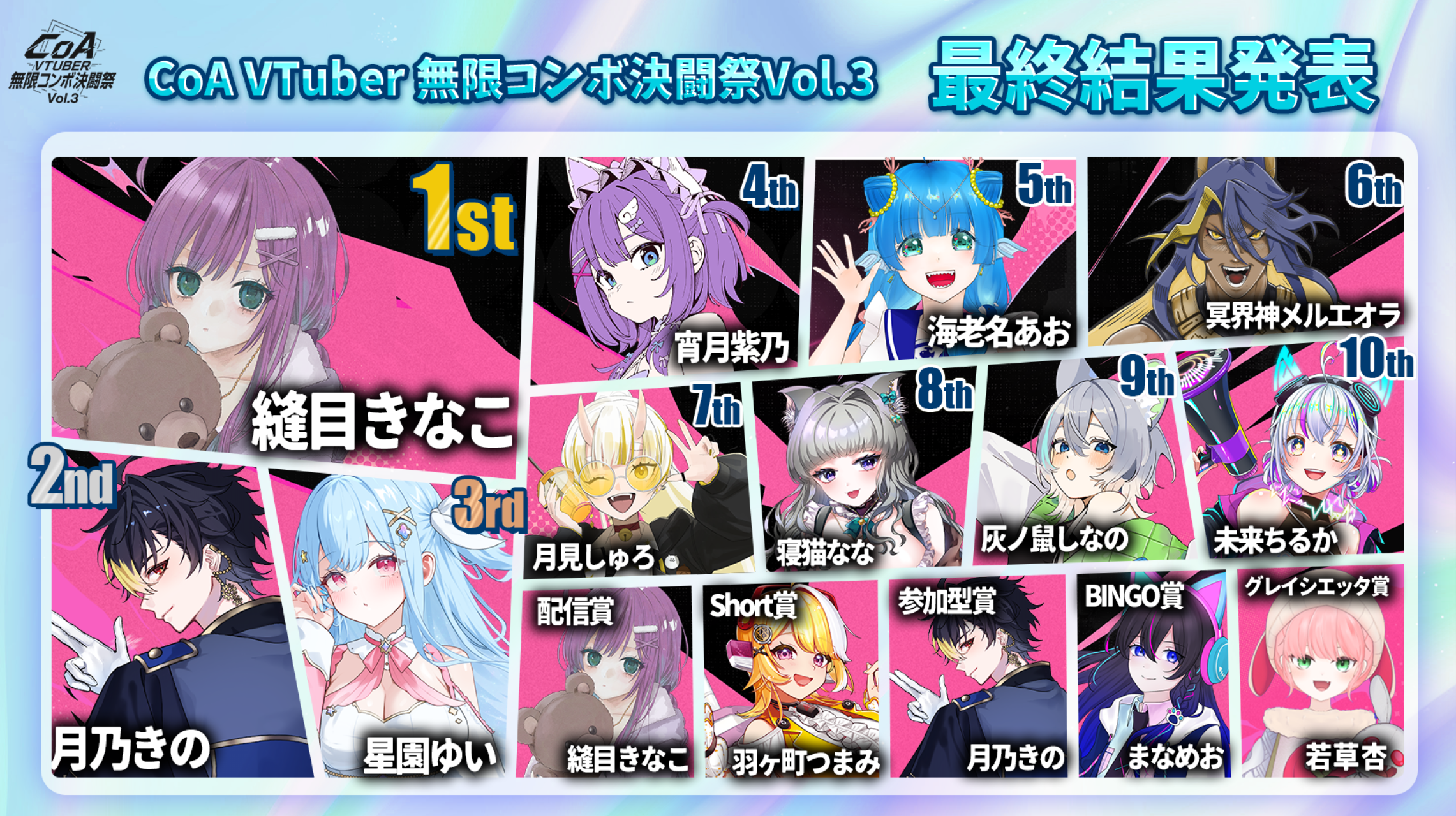 イベントでは、縫目きなこさんが優勝し、月乃きのさん、星園ゆいさんが上位入賞。