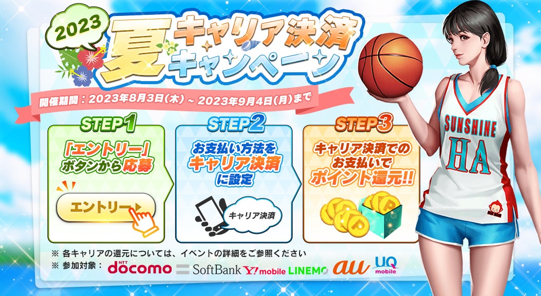 株式会社ファイブクロスが提供するスマホ向け対戦型ゲーム「スマッシュダンク」は、2023年8月3日から「キャリア決済キャンペーン」を開催しています。
