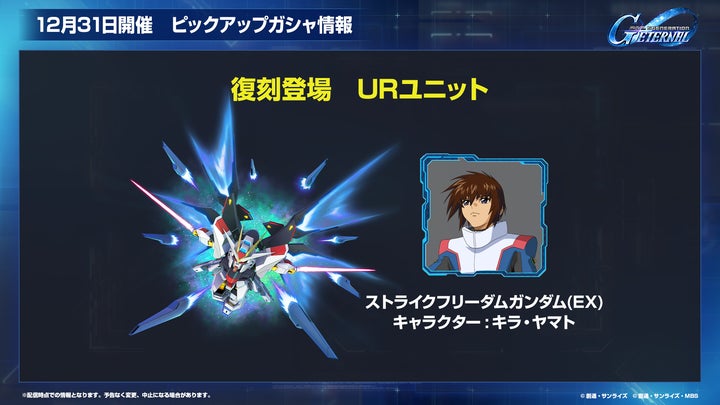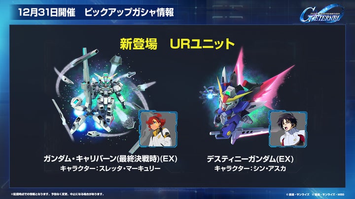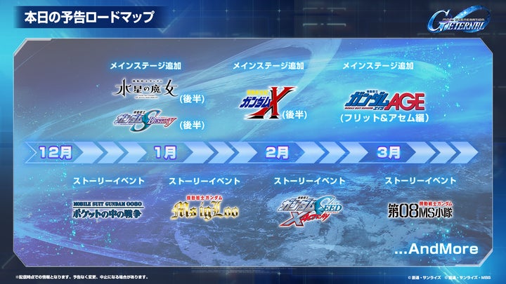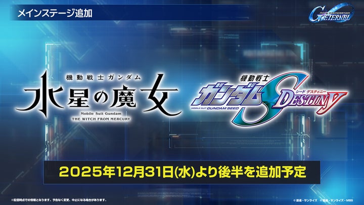 - 12月31日より「機動戦士ガンダムSEED DESTINY」(後半)と「機動戦士ガンダム 水星の魔女」(後半)がメインステージに追加。