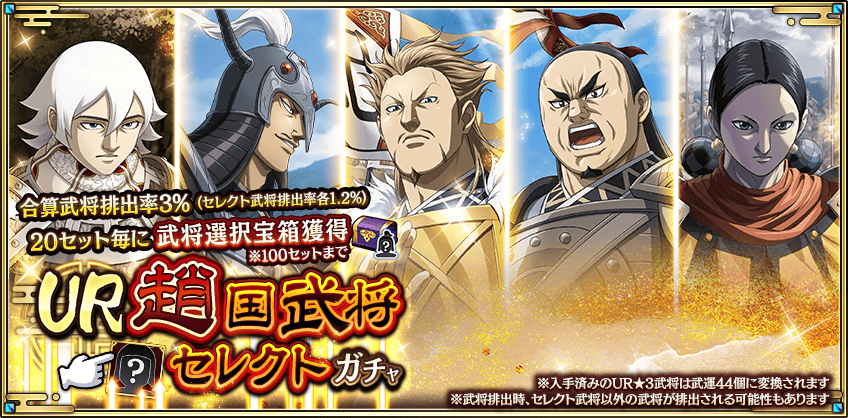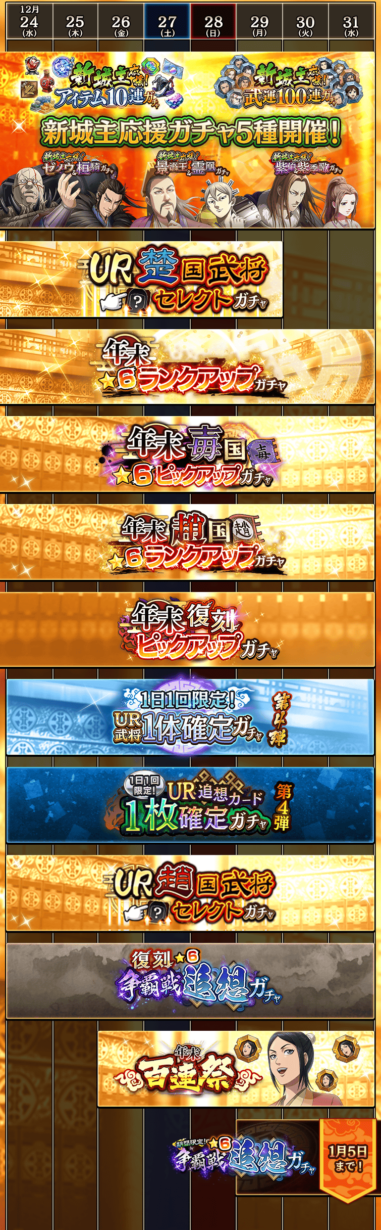 年末には様々なキャンペーンが開催され、UR武将確定ガチャや趙国武将セレクトガチャなどが実施される。