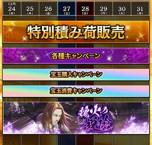 - 年末大戦キャンペーンとして、様々なガチャやパック販売を実施。