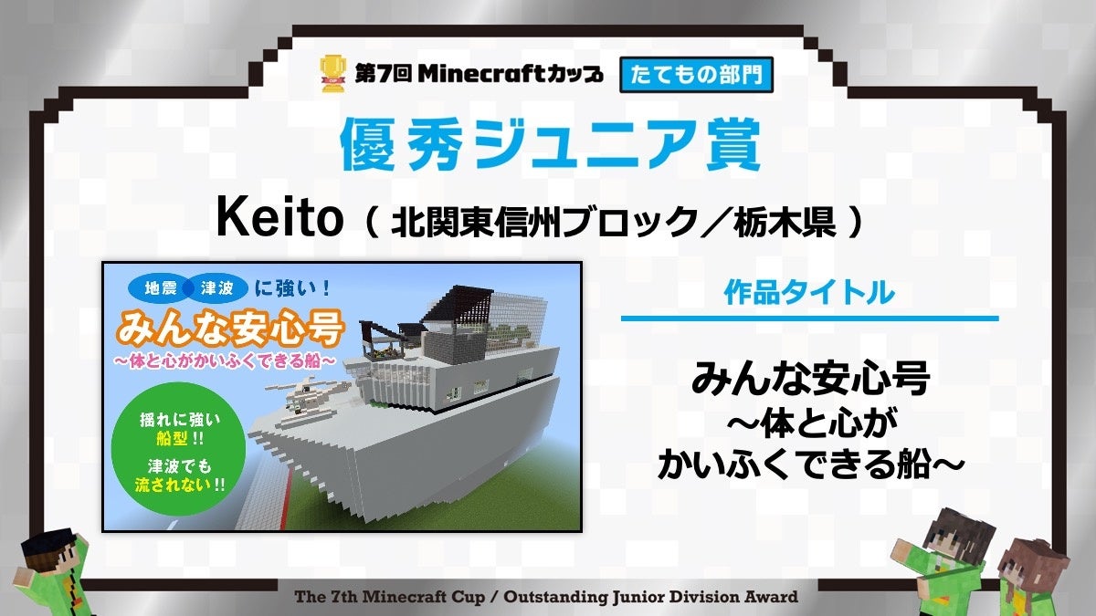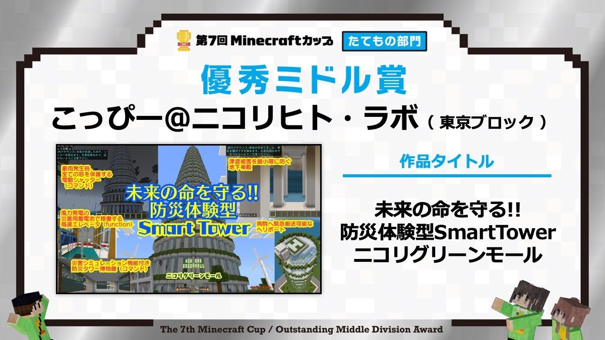 優秀ミドル賞は「こっぴー@ニコリヒト・ラボ」の「未来の命を守る!! 防災体験型SmartTower ニコリグリーンモール」、優秀ジュニア賞は「Keito」の「みんな安心号〜体と心がかいふくできる船〜」が受賞した。