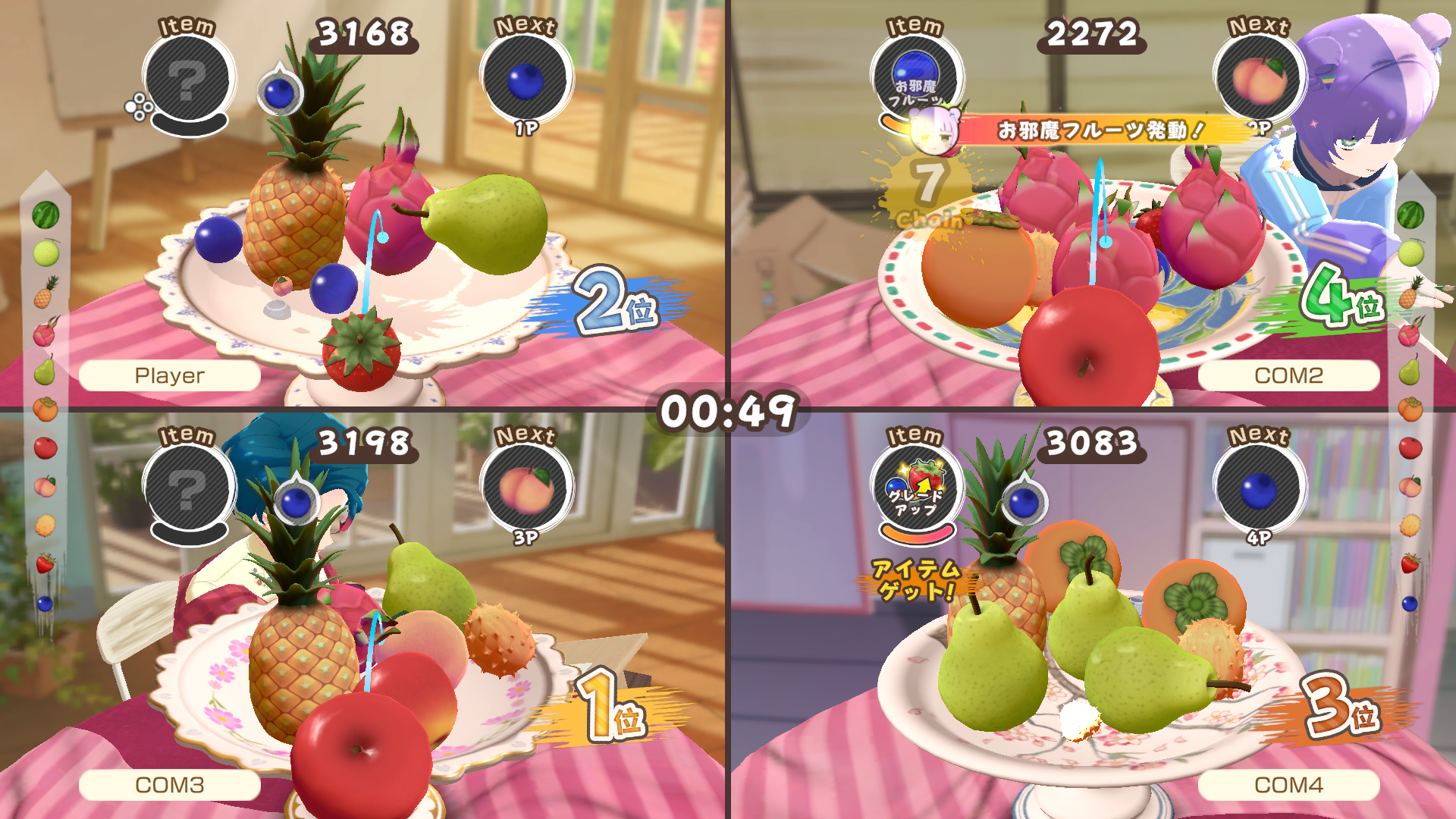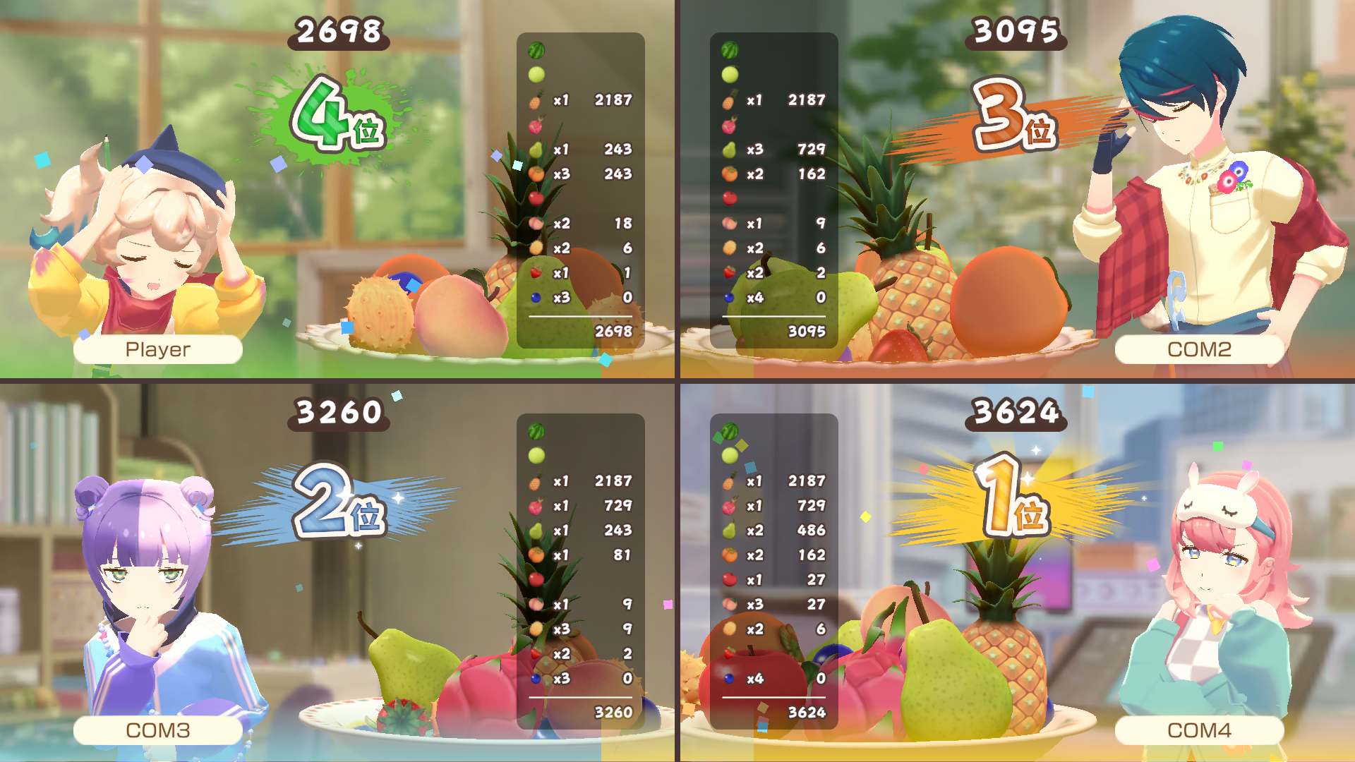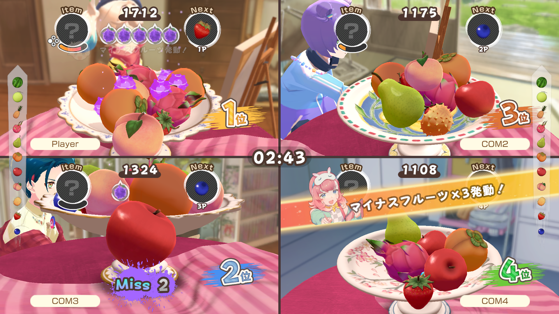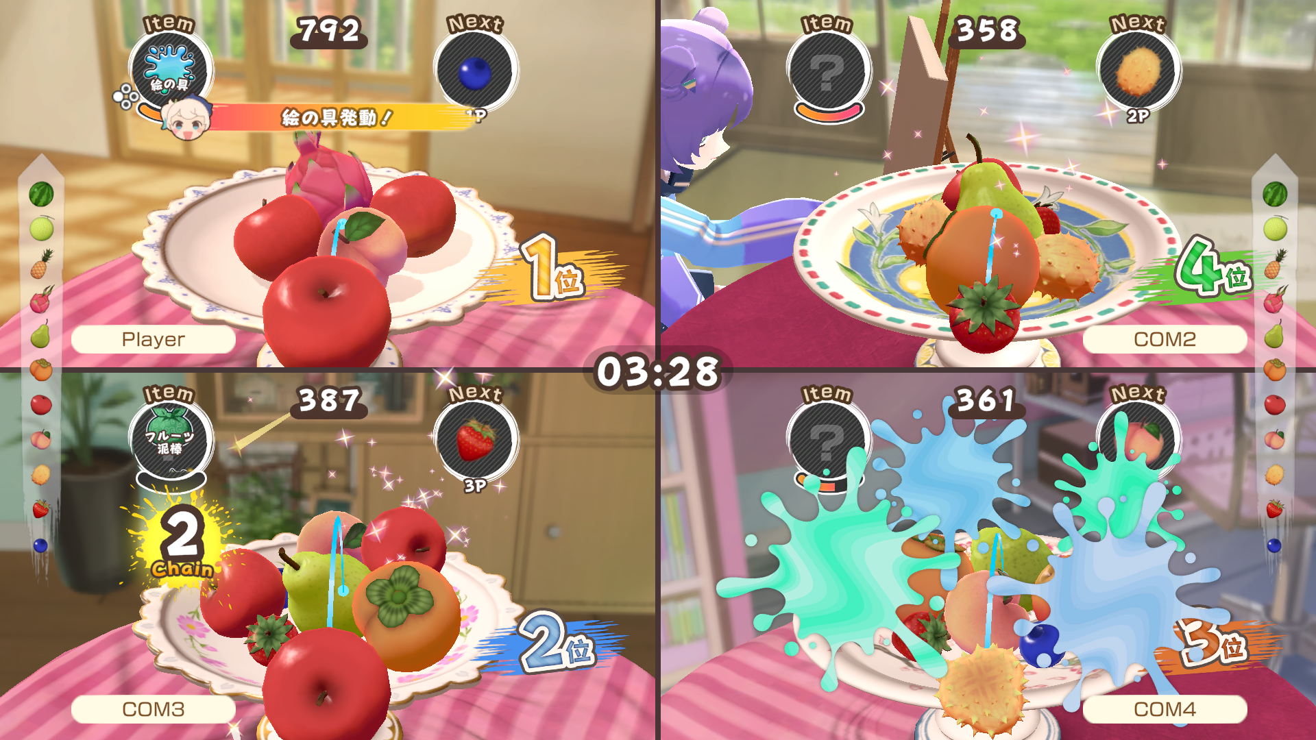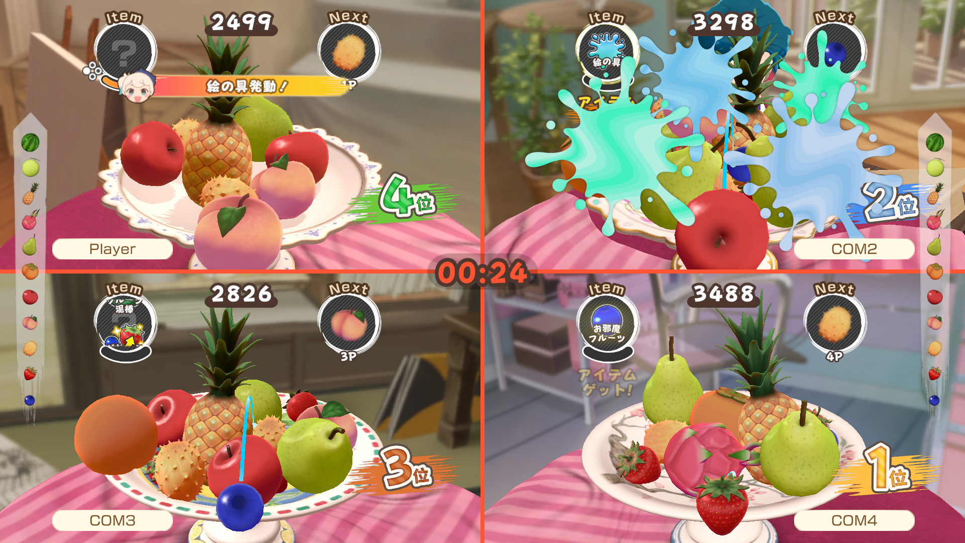 本作は、シンプルで奥深いパズルゲーム『フルーツマウンテン』を対戦型に進化させたもので、最大4人でのローカル対戦、オンライン対戦、フレンドとの招待マッチングなど、多様なプレイスタイルに対応。