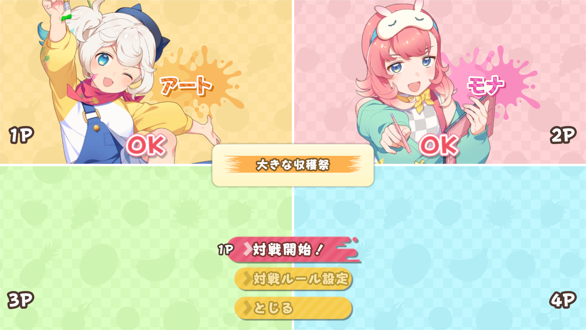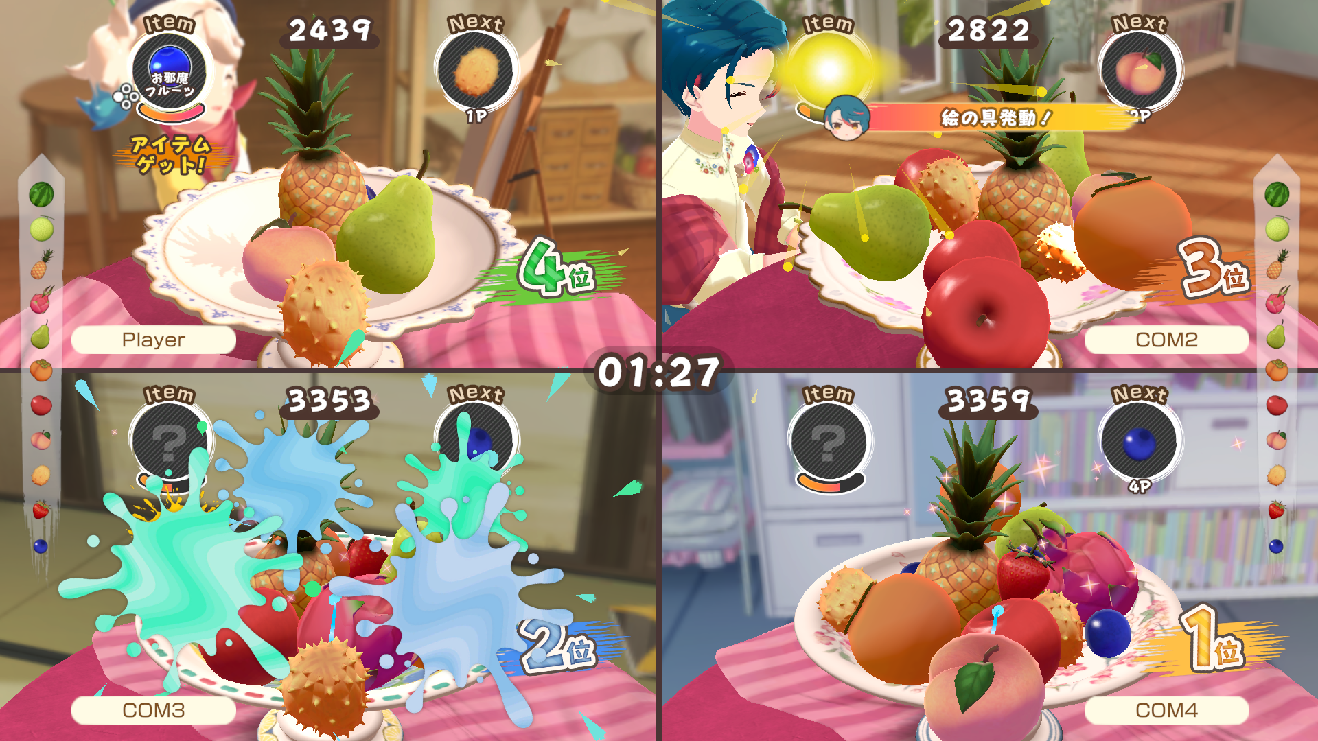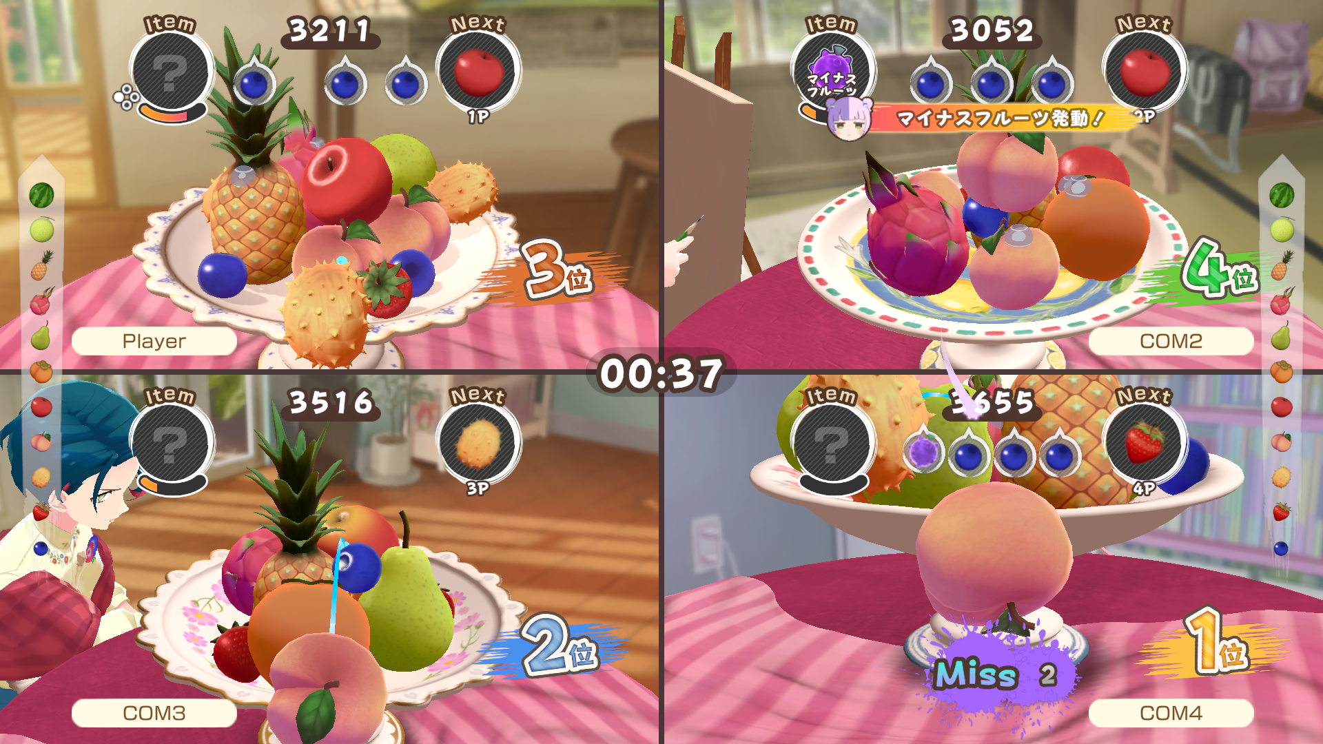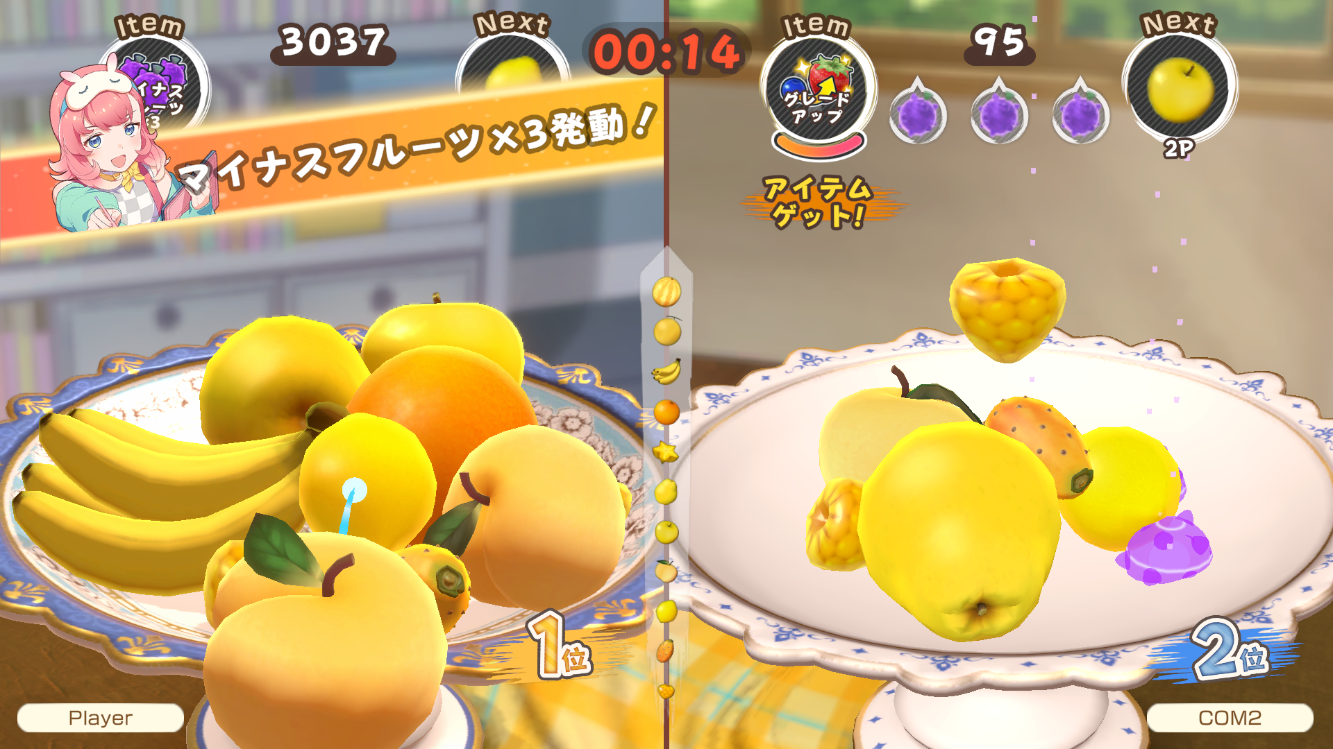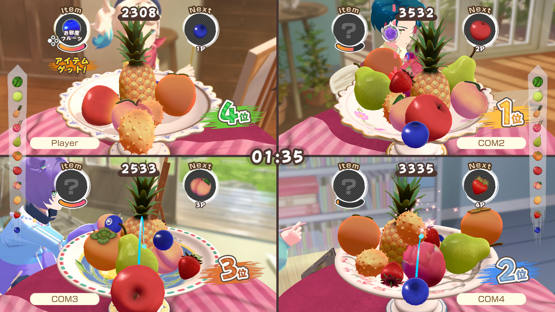 本作は、シンプルで奥深いパズルゲーム『フルーツマウンテン』を対戦型に進化させたもので、最大4人でのローカル対戦、オンライン対戦、フレンドとの招待マッチングなど、多様なプレイスタイルに対応。