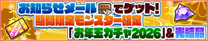 期間中は、最大15個の「光結晶」や育成素材「ダイカクチョウの宝玉」が手に入るログインボーナス、2026年1月1日(木)から1月15日(木)までのログインで「光結晶」10個と限定モンスターが出現する「お年玉ガチャ2026」を入手できる。