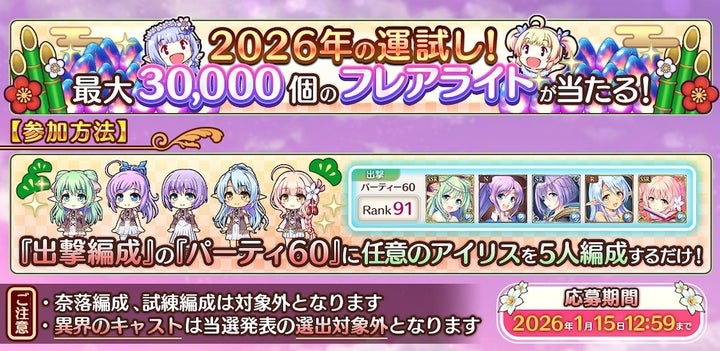 - 最大30,000個のフレアライトが当たる『あいミス編成くじ2026』を開催。編成キャラの一致数で報酬が決定。