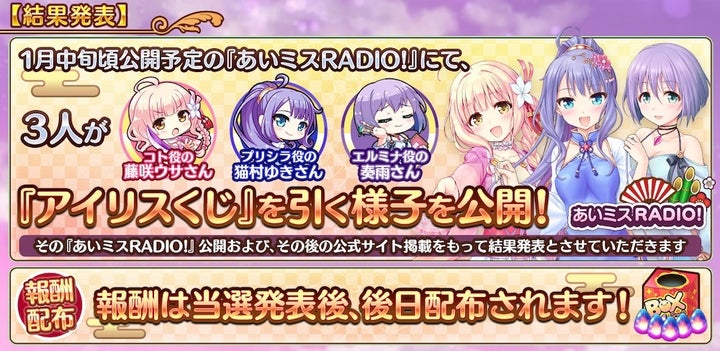 - 『あいりすミスティリア!』にて『ゆく年くる年キャンペーン』を開催。最大150回召喚可能なチケット配布、有償限定ステップアップ召喚などを実施。