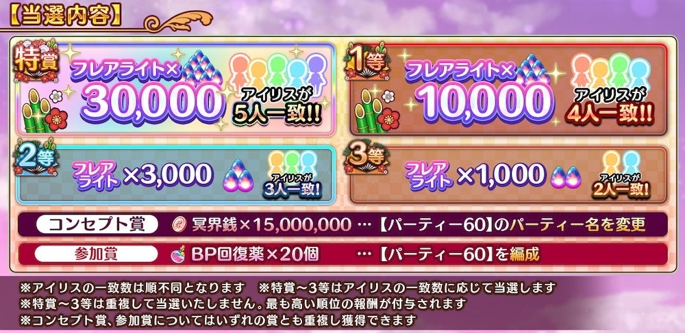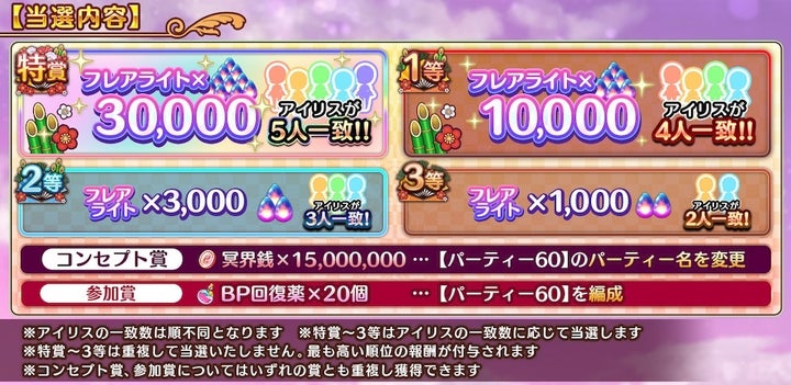 これは、特定の編成で応募すると、編成キャラの一致数に応じてフレアライトを獲得できるというもの。