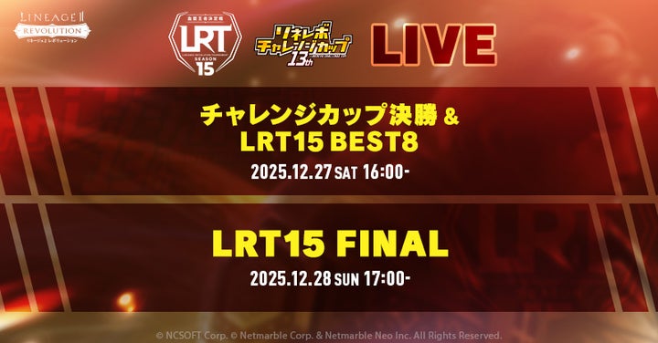 - 『リネージュ2 レボリューション』の公式大会「LRT SEASON15」BEST8と決勝戦がYouTube Liveで生放送。