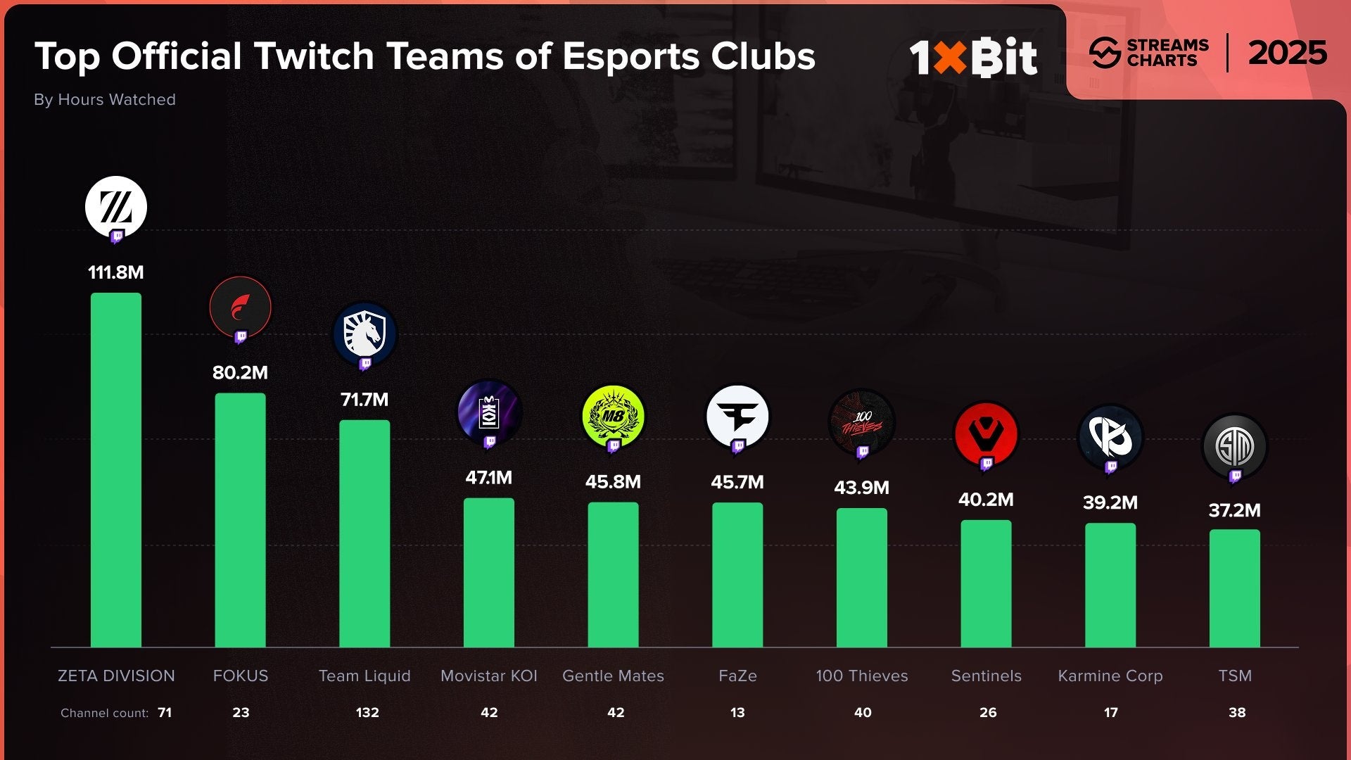- Team LiquidやFaZe Clanを抑え、年間1億1,180万時間を記録。