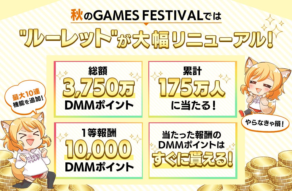 ぜひこのキャンペーンに参加し、ルーレットメダルを集めて『秋のDMM GAMES FESTIVAL』を楽しんでください。