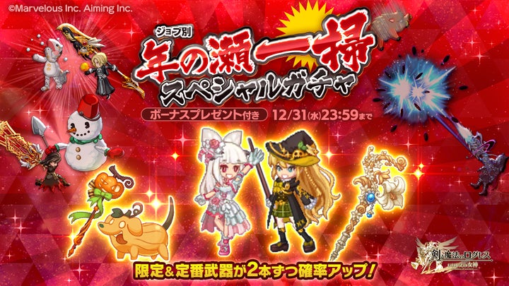 • ジョブ別 年の瀬一掃スペシャルガチャ販売。期間限定武器を含む、強力な武器を手に入れるチャンス。