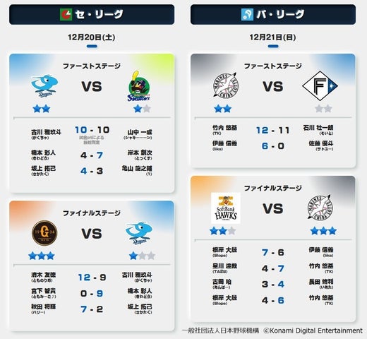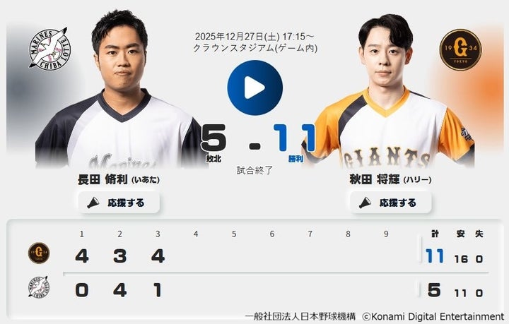 コナミデジタルエンタテインメント主催のプロ野球eスポーツリーグ「プロスピA プロリーグ」2025シーズンの最終戦「e日本シリーズ」が12月27日に開催され、読売ジャイアンツが千葉ロッテマリーンズを下し、初の日本一に輝いた。