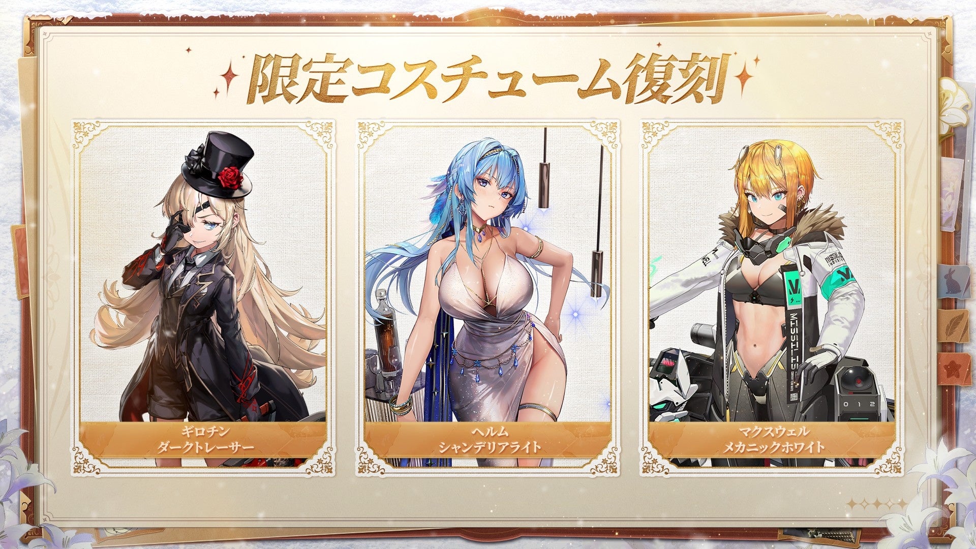 - スノーホワイト:ヘビーアームズ, ラピ:レッドフード, アリス, クエンシー:エスケープクイーン, エマ:タクティカル・アップ, ヘルム, ギロチン, マクスウェル