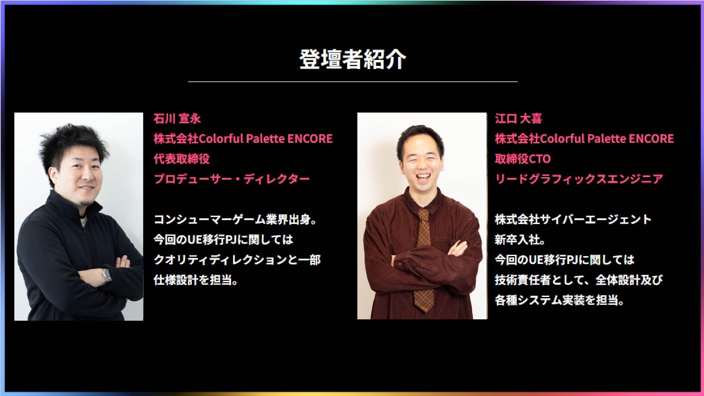 代表取締役 石川宣永と取締役CTO 江口大喜が、『プロジェクトセカイ COLORFUL LIVE 5th – Frontier -(以下、セカライ5th)』におけるUnreal Engine活用例を紹介。