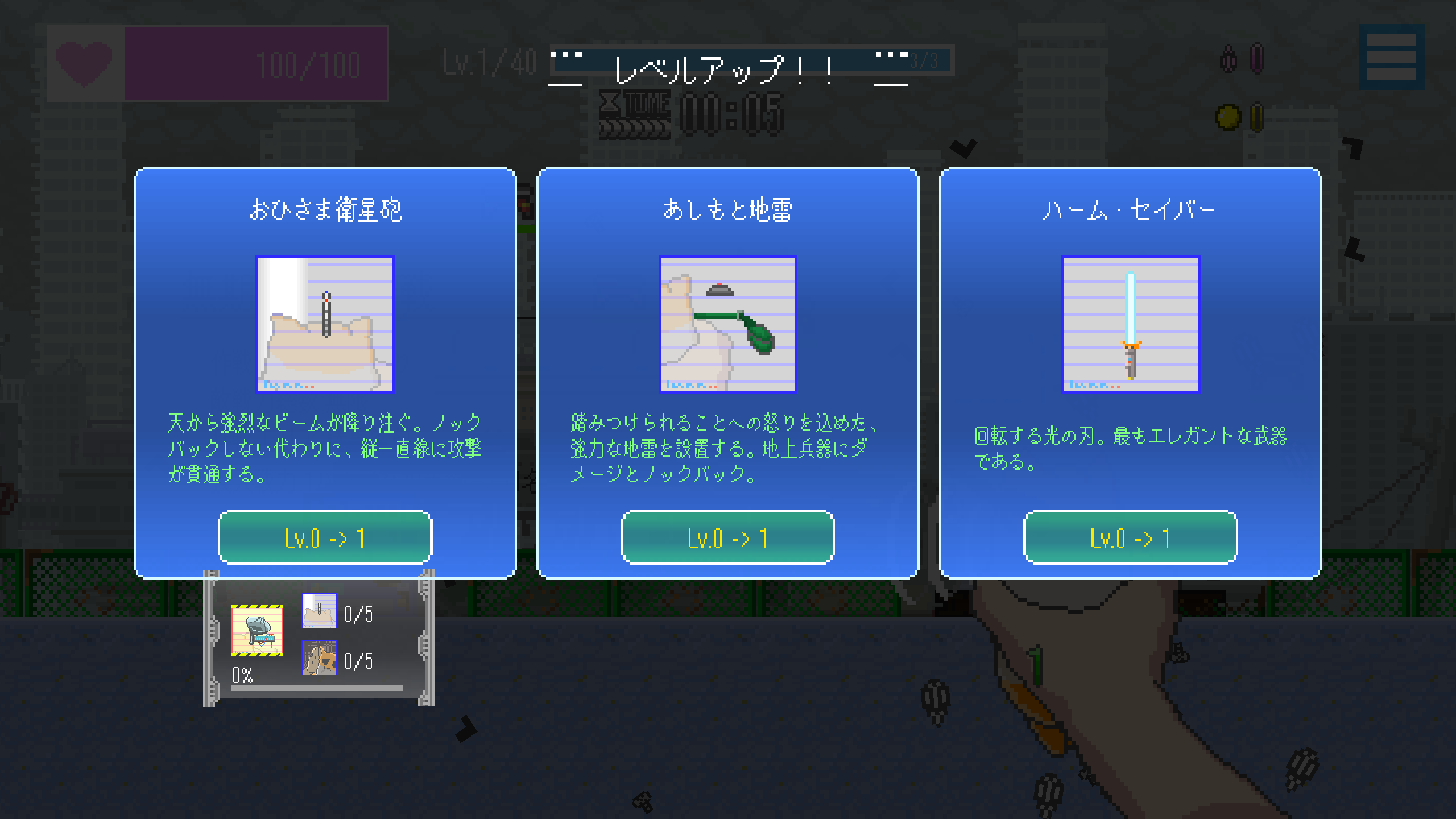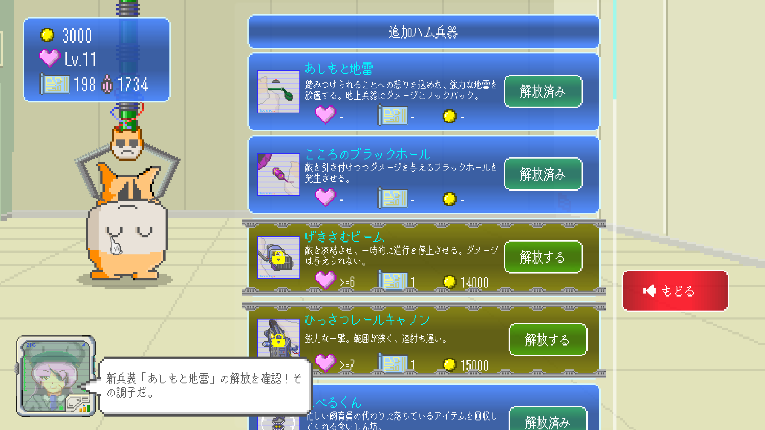 - ハムスター型殲滅兵器「もちお」を育成し、国を守る終末国土防衛アドベンチャー。