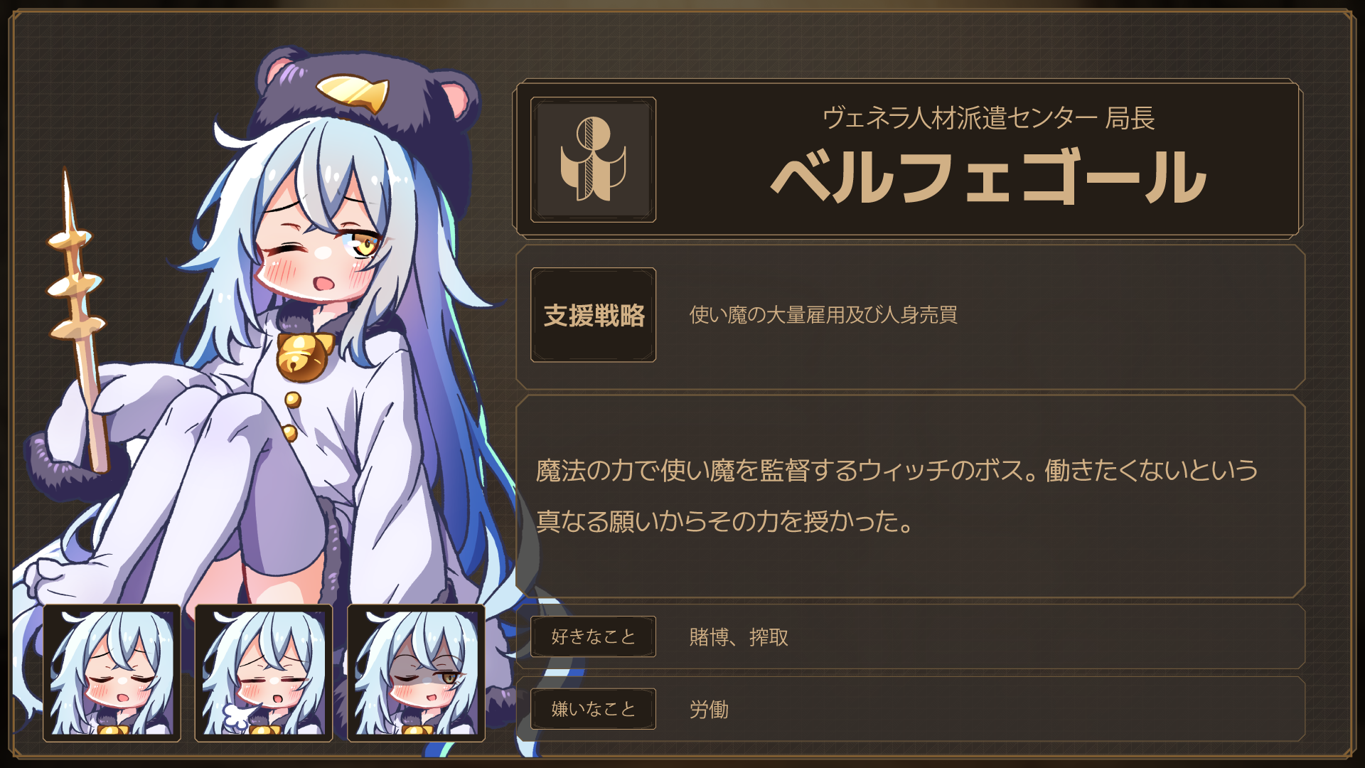プレイテストでは、ベルフェゴールなど5名のキャラクターとのミーティングが可能です。