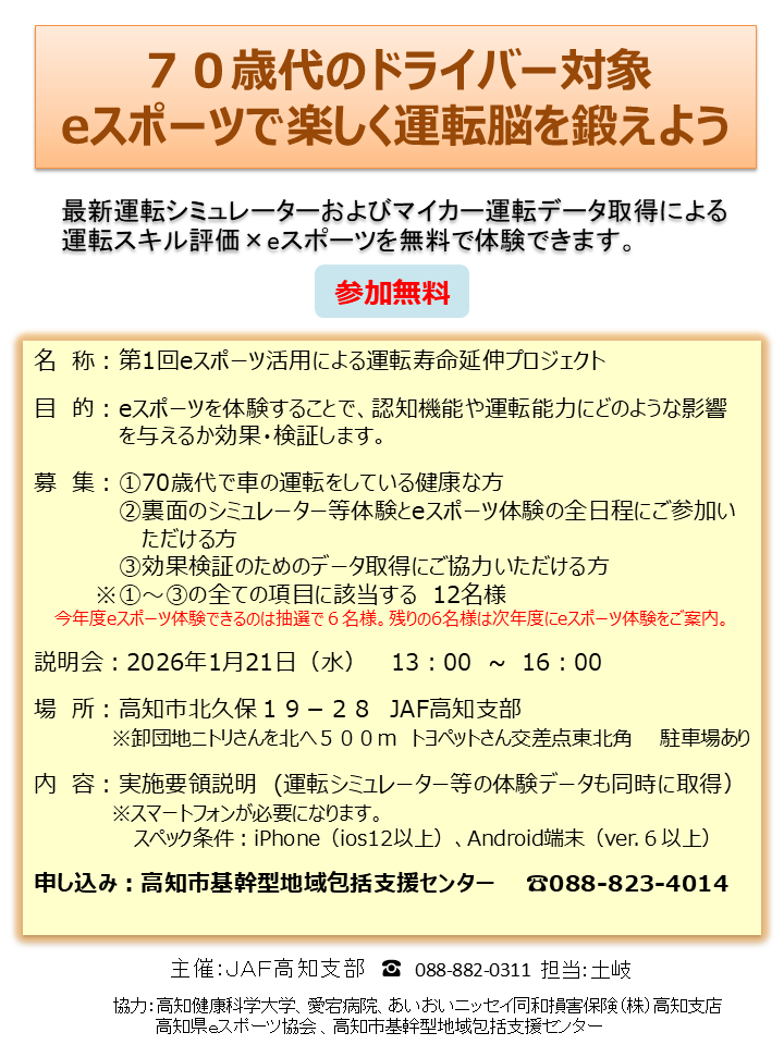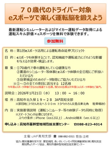 - JAF高知支部が70歳代ドライバー向けにeスポーツを活用した運転寿命延伸プロジェクトを実施。