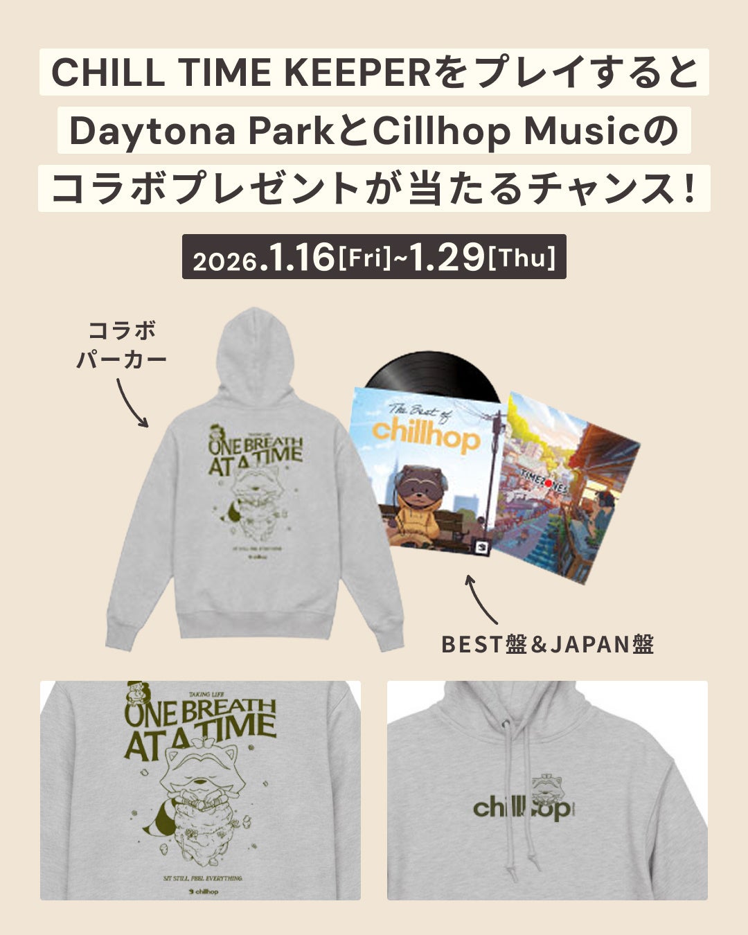 ゲームプレイと連動したプレゼントキャンペーンも実施され、Daytona ParkとChillhopのコラボパーカー+Chill Music BEST盤とJAPAN盤の3点SETが10名にプレゼントされます。