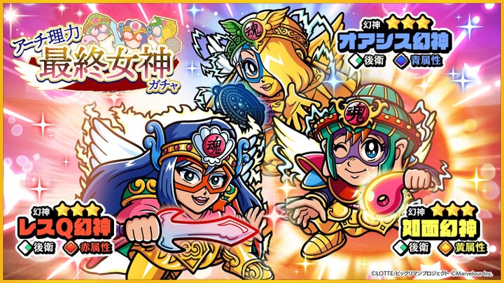 また、新キャラ「如面幻神」、「レスQ幻神」、「オアシス幻神」が登場する「アーチ理力最終女神ガチャ」や、ダメージチャレンジイベント「創聖使の魔儀式 邪悪洗礼・オルドトス」も開催。