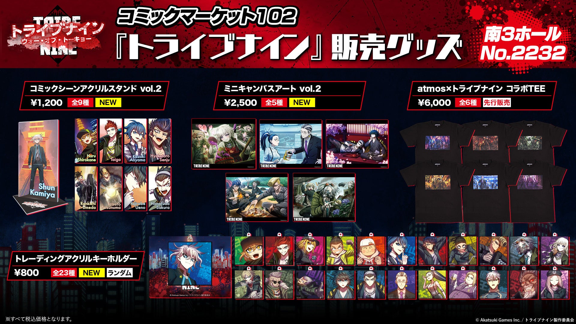 コミックマーケット102で販売されるグッズには、『トライブナイン/ウォー・オブ・トーキョー』の連載中のマンガアプリ「HykeComic」のキャラクターグッズや、スニーカーショップ『atmos』とのコラボレーショングッズが含まれます。