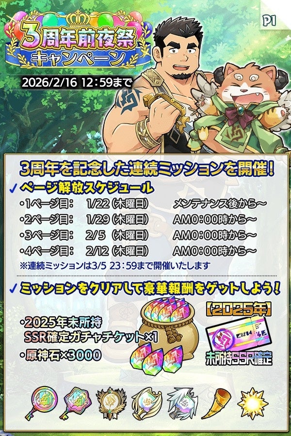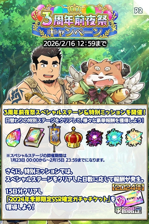 - 3周年前夜祭キャンペーンでは豪華報酬や特別ステージ、ミッションが用意される。