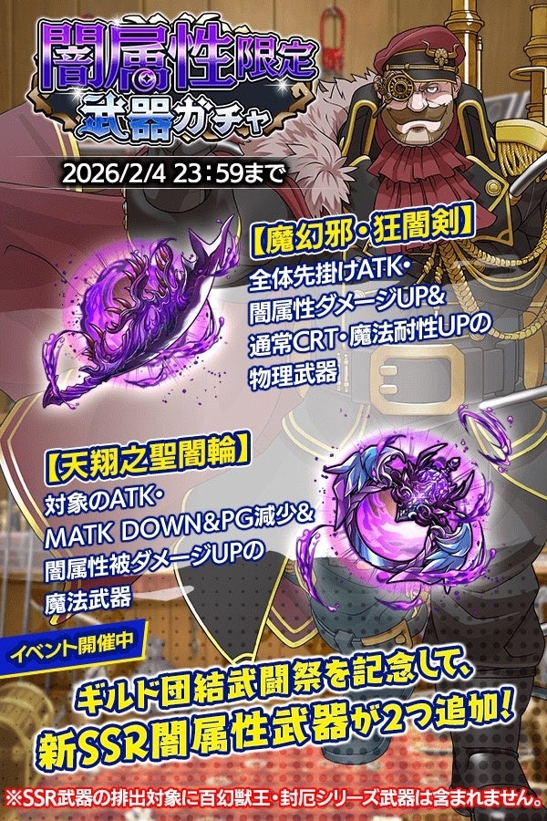 また、「ヴァルテオスシリーズガチャ」や「ギルド団結武闘祭応援 闇属性即戦力未所持SSR確定ステップアップガチャ」も開催され、新シリーズ神器「ディミタ―」が登場する。