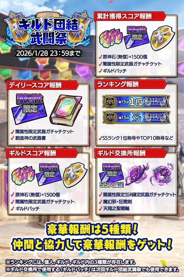 - ギルドメンバーとボスに挑む「ギルド団結武闘祭」開催。