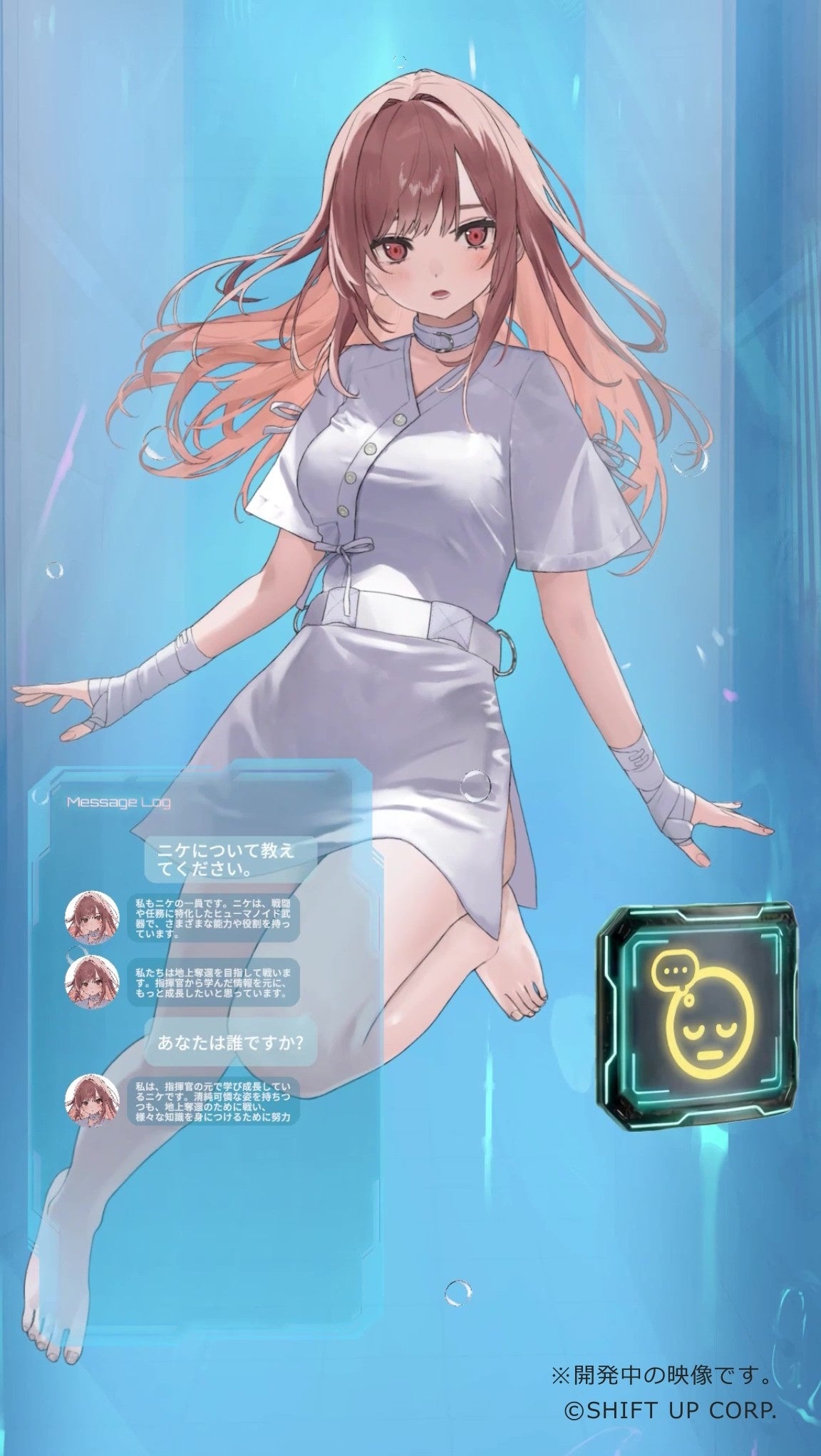 このコンテンツは、iOS・Android・PC向けゲーム『勝利の女神:NIKKE』の世界観を基に、開発中のニケ(イラスト:真白K大)と会話できるもの。