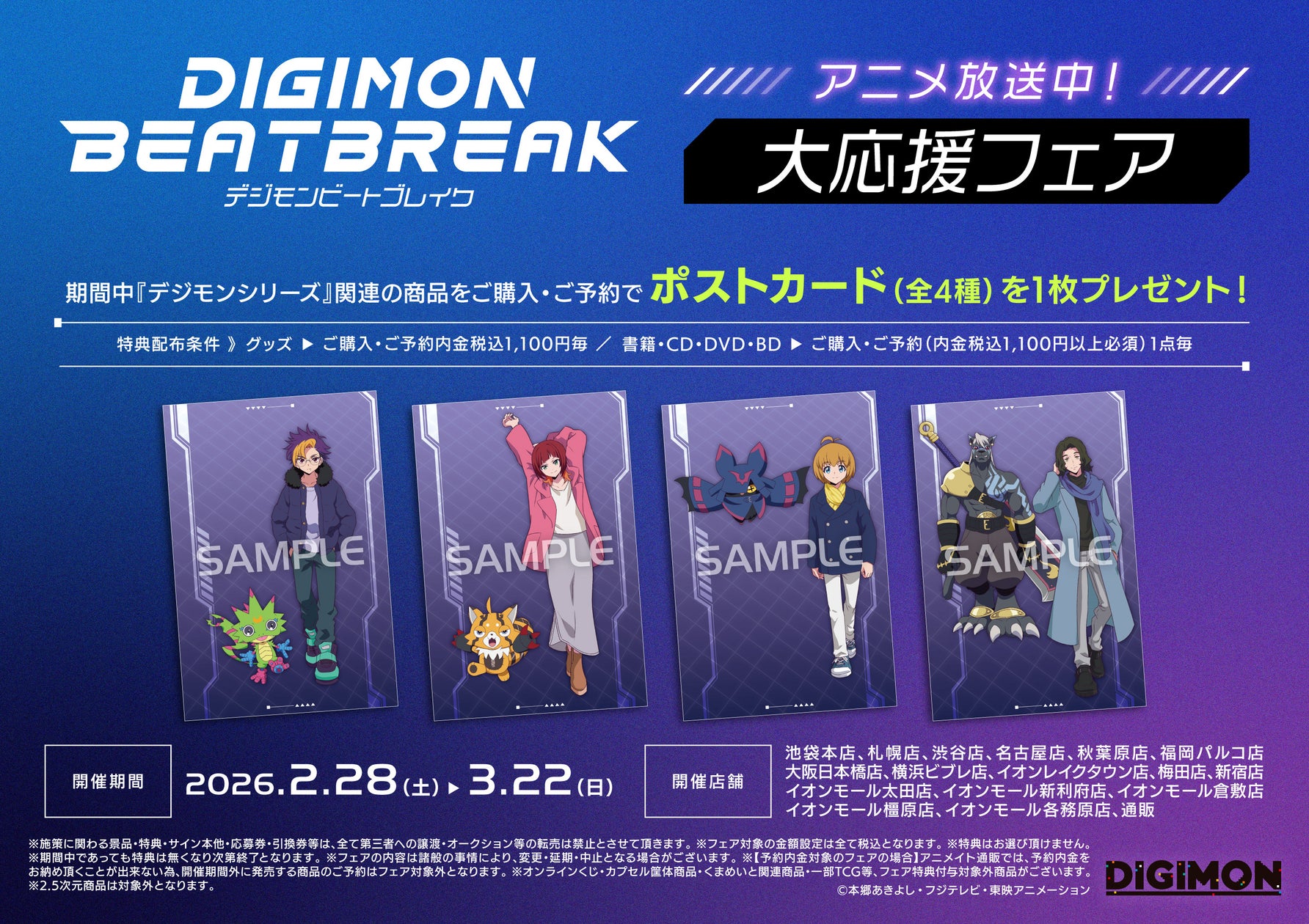 - 購入特典として、デジモンシリーズ関連グッズ購入でポストカードプレゼント。